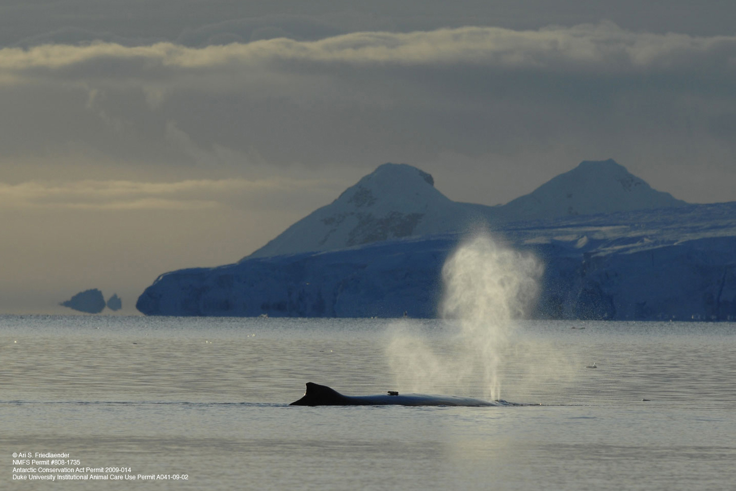 A tagged humpback whale surfaces in Antarctica.