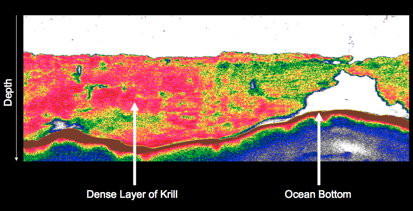 An example of a large krill aggregation, courtesy of Dr. Meng Zhou, University of Massachusetts.