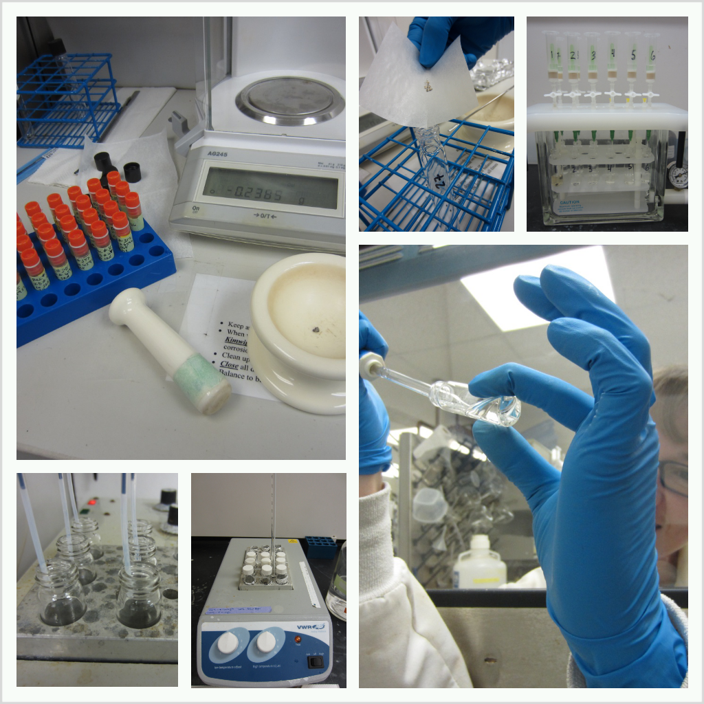 The very first steps of the process are freeze drying the skin sample and removing the lipids (resultant skin sample in top pane). Then, an appropriate amount (5-10mg) of sample must be ground with a mortar and pestle (lower left) and transferred to a glass vial (lower right), in which all the chemistry is performed.